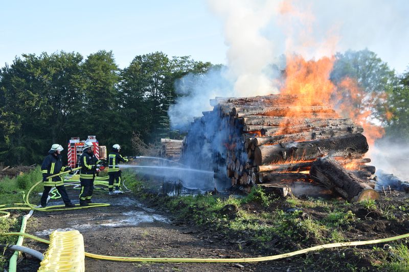 Um den Holzstapel besser löschen zu können, forderte die Feuerwehr Hemer auch Unterstützung von der Feuerwehr Iserlohn an. Die Kollegen rückten mit Ihrem geländegängigen Radlader und einem LKW mit Kran an. Mit dem Radlader wurden zunächst die obersten Stämme des Stapels auseinandergeschoben. Weitere Hilfe kam von zwei Forstwirten, die mit Ihren Forsttraktoren die Baumstämme auseinanderpackten, um auch tiefer gelegene Glutnester zu löschen. Nach gut sechs Stunden konnte „Feuer aus“ gemeldet und mit den Aufräumarbeiten begonnen werden. Die Feuerwehr war mit 52 Einsatzkräften der Wache, der Löschgruppen Ihmert, Frönsberg, Deilinghofen, Landhausen und Becke, sowie drei Kräften der Berufsfeuerwehr Iserlohn im Einsatz. Die Wache wurde für die Dauer des Einsatzes durch Kollegen der anderen Wachabteilungen sowie der Löschgruppe Hemer besetzt.